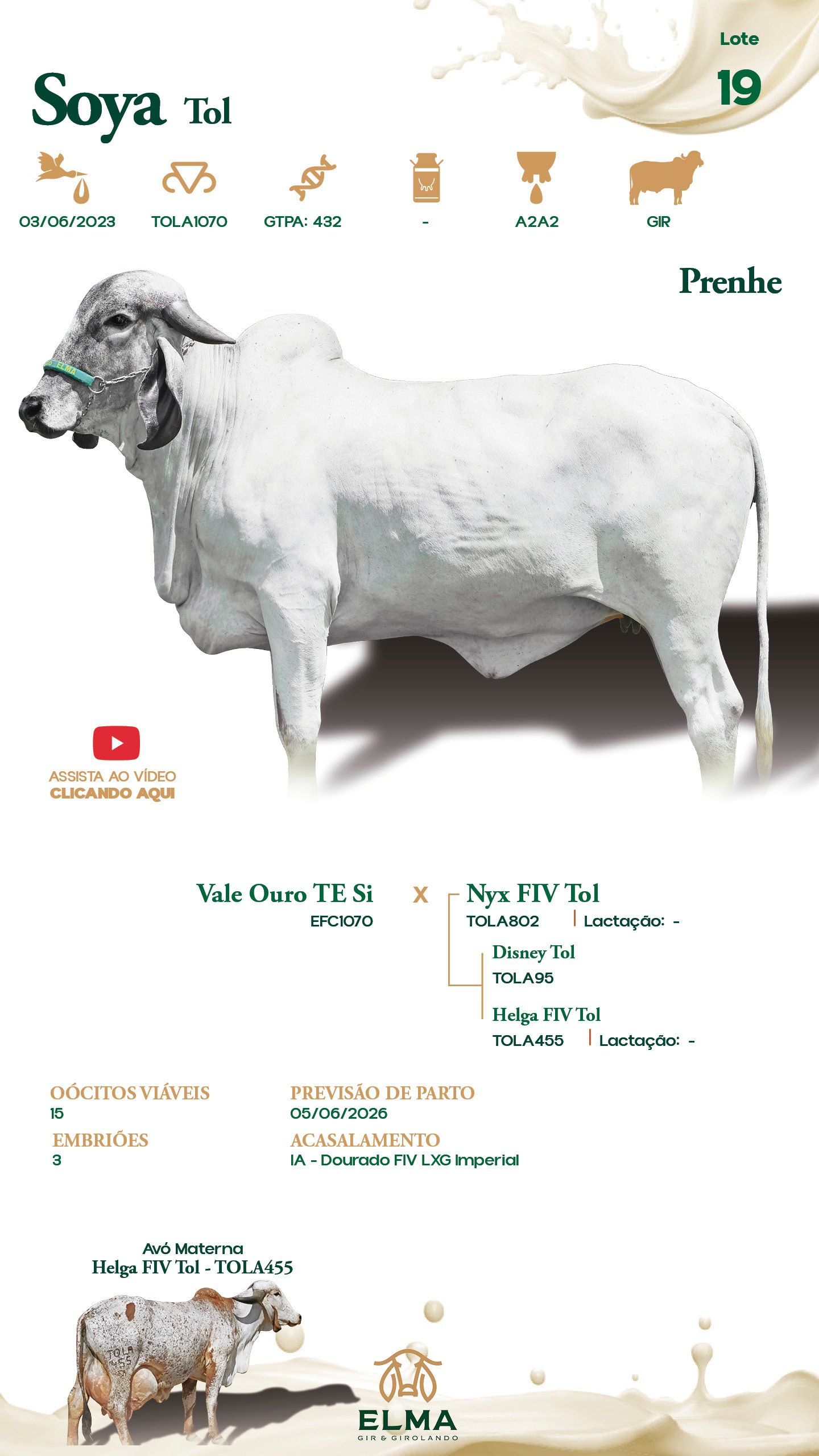 Prenhez / Reprodutivo: Prenhe. Oócitos Viáveis: 15. Embriões: 3. Previsão de Parto: 05/06/2026. Acasalamento: IA – Dourado FIV LXG Imperial.