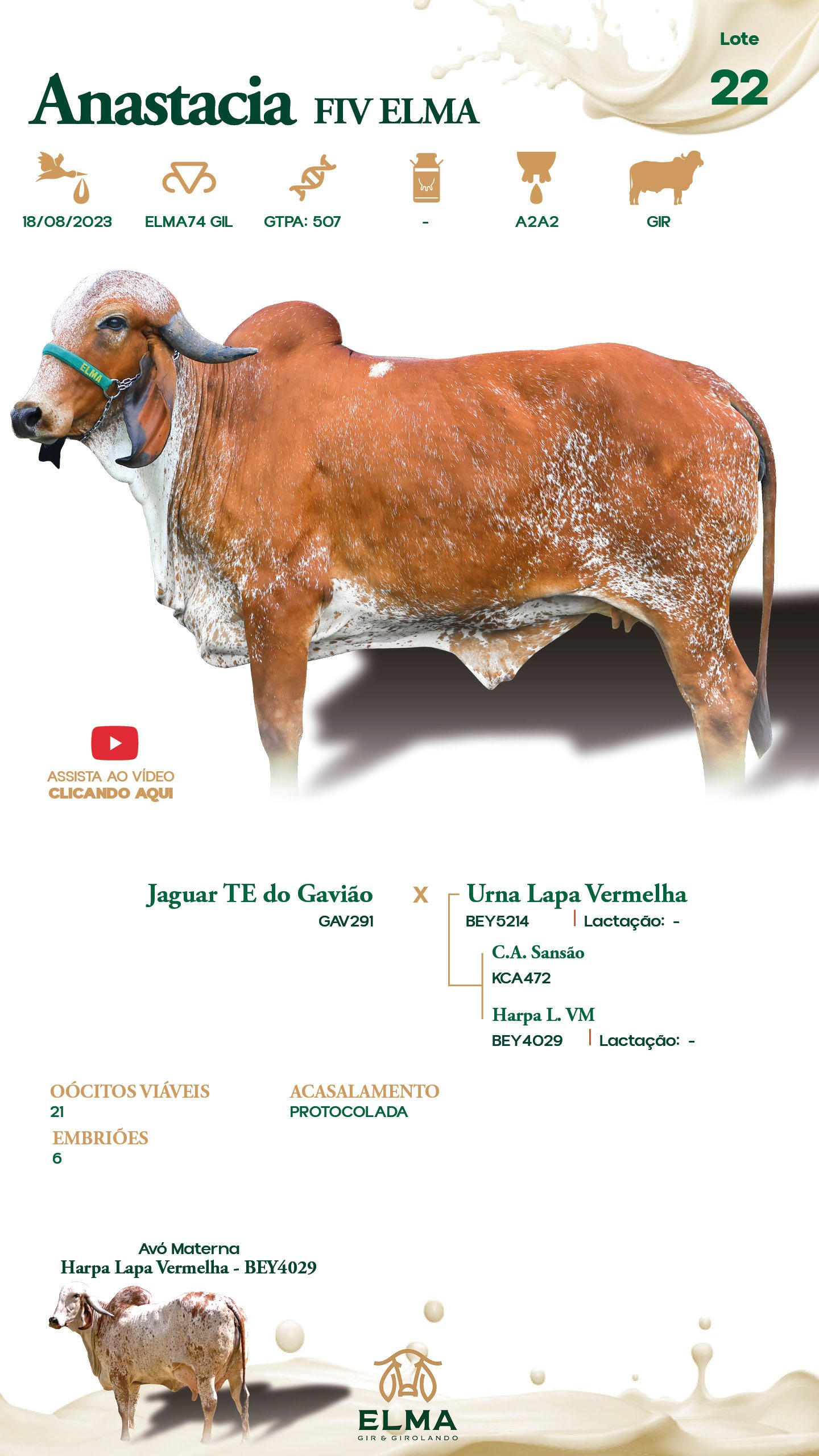 Prenhez / Reprodutivo: Acasalamento Protocolada. Oócitos Viáveis: 21. Embriões: 6.