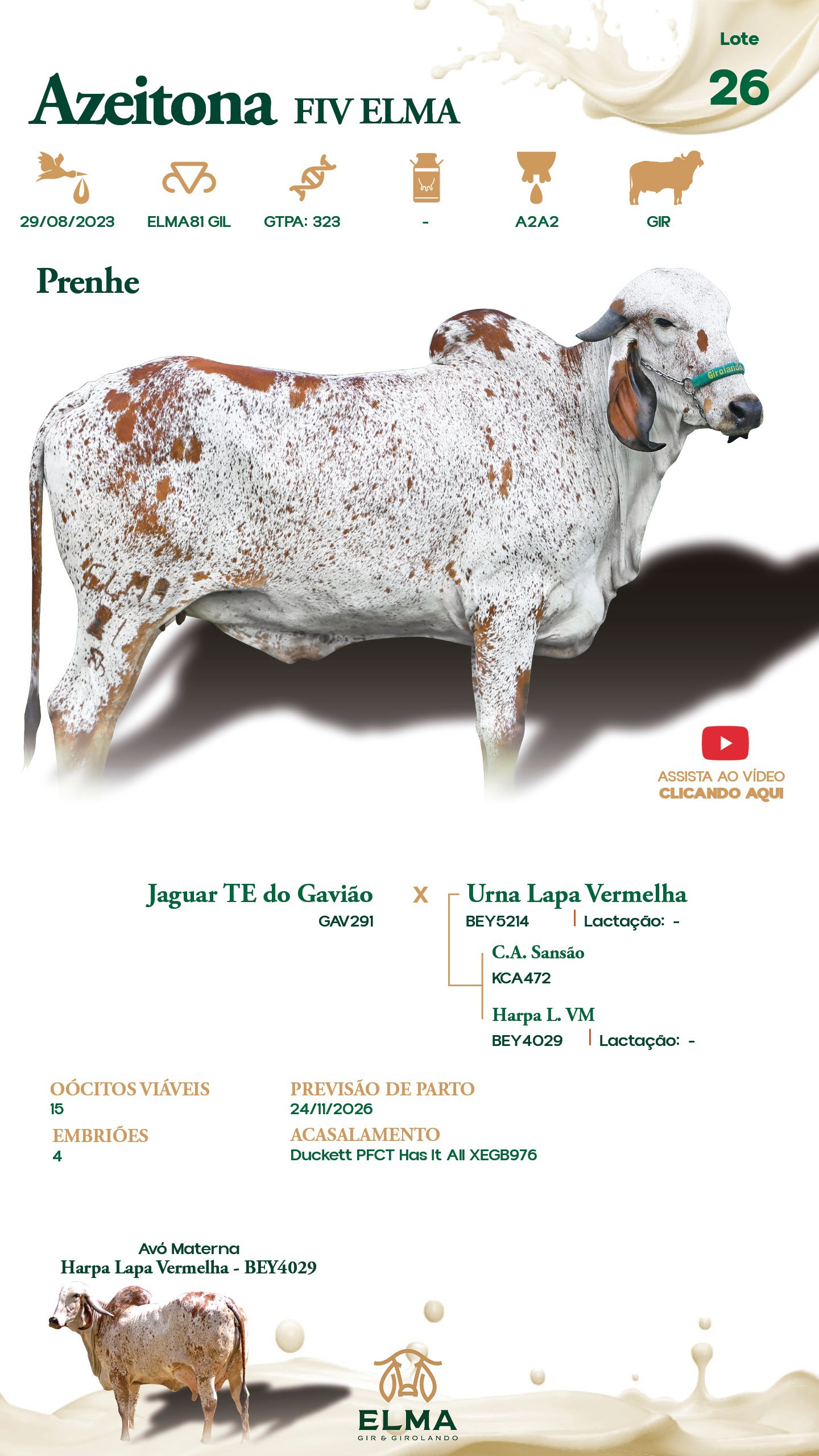 Prenhez / Reprodutivo: Prenhe. Oócitos Viáveis: 15. Embriões: 4. Previsão de Parto: 24/11/2026. Acasalamento: Duckett PFCT Has It All XEGB976.