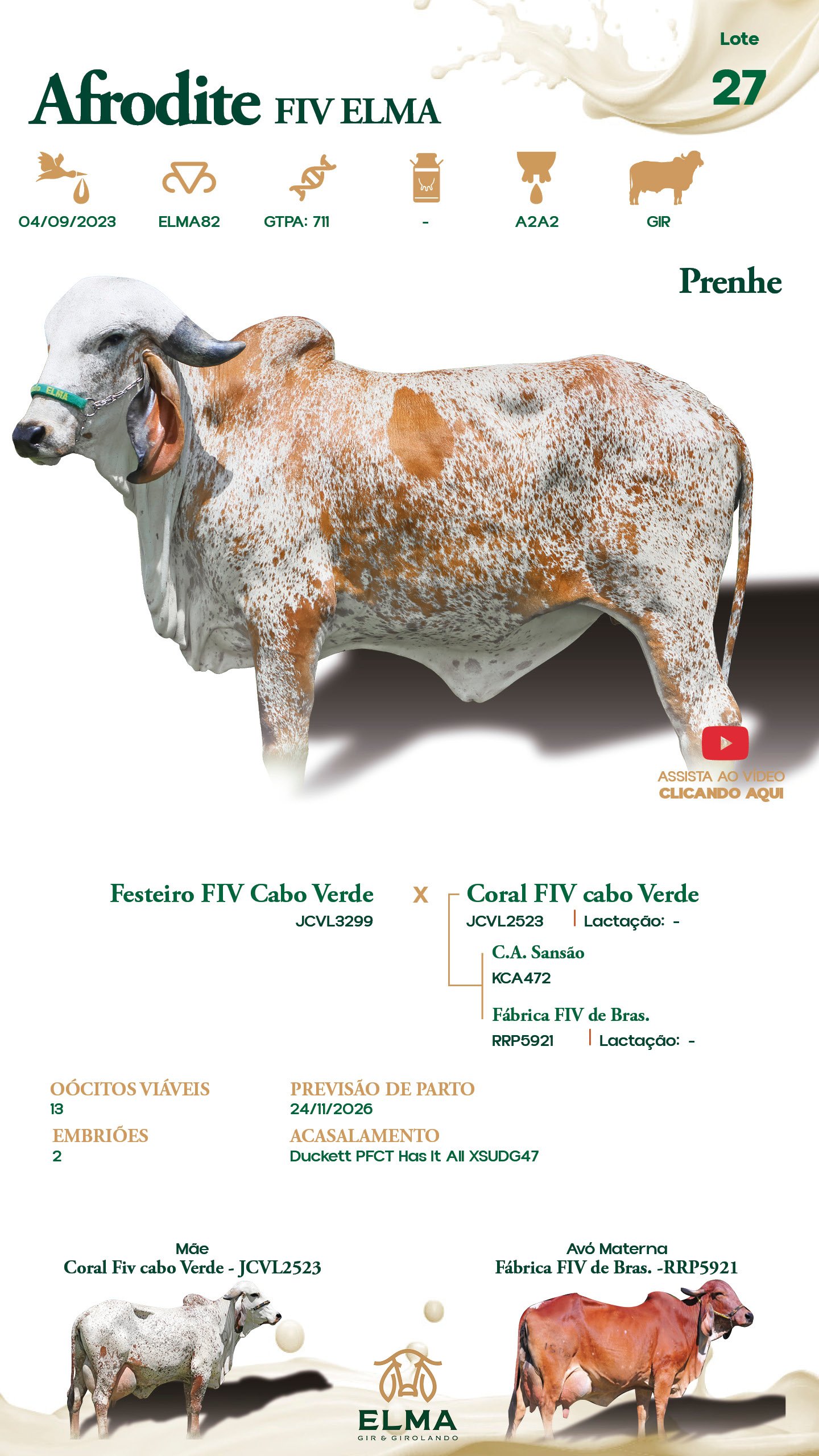 Prenhez / Reprodutivo: Prenhe. Oócitos Viáveis: 13. Embriões: 2. Previsão de Parto: 24/11/2026. Acasalamento: Duckett PFCT Has It All XSUDG47.