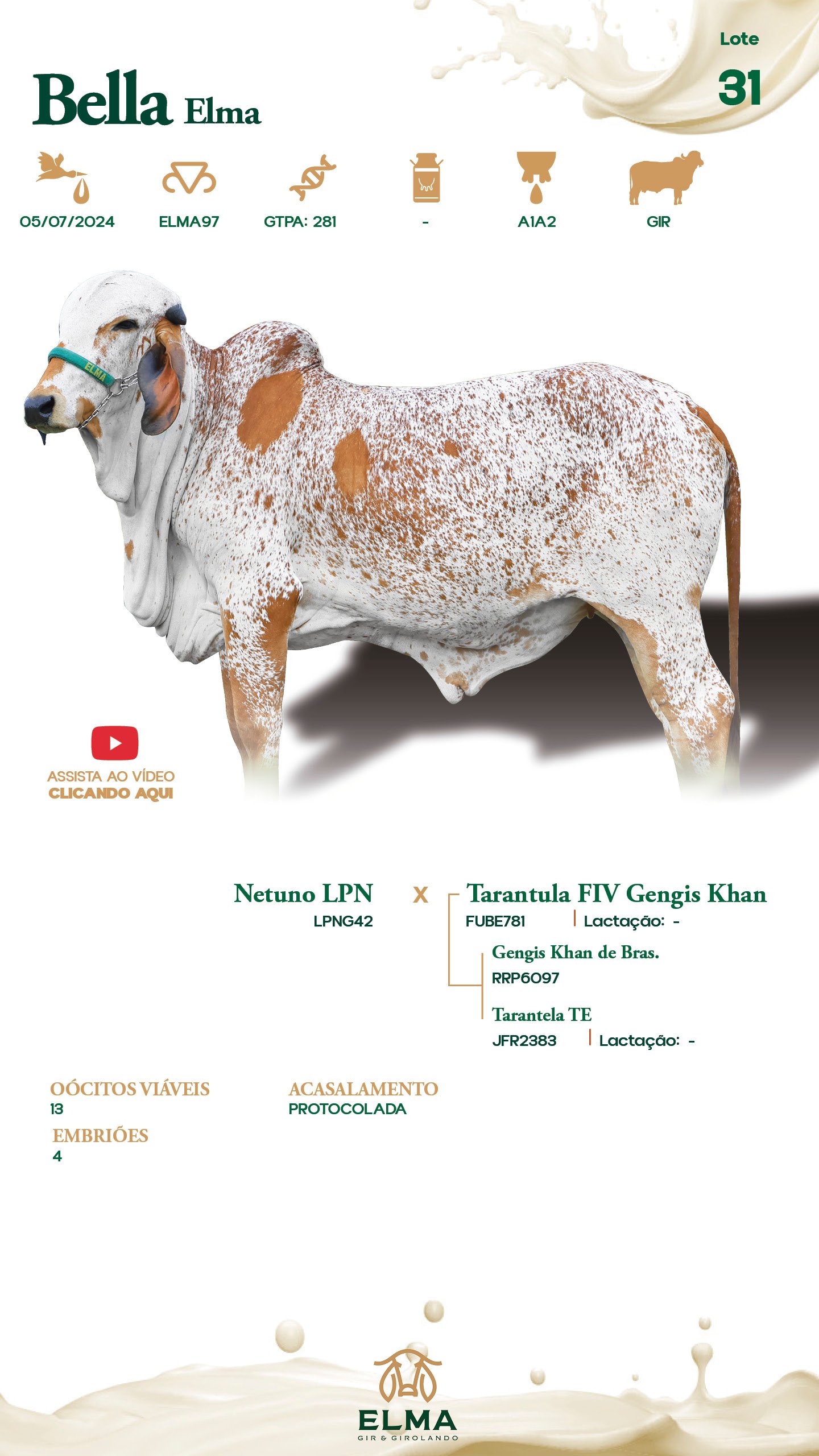 Prenhez / Reprodutivo: Acasalamento Protocolada. Oócitos Viáveis: 13. Embriões: 4.