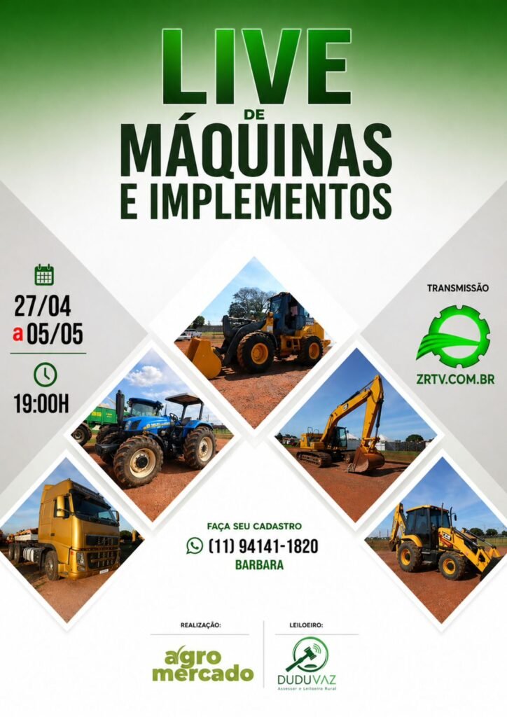 Fale com nossa atendente - Bruna Fale com nossa atendente - Joyce Fale com nossa atendente - Mylena Fale com nosso atendente - Pedro CA 01 – VAGÃO FORRAGEIRO 6 500 Condição de Pagamento: Lance x30 (multiplicado por 30)Sendo Pago, em: 12 meses, dividido em 6 Parcelas Triplas + 6 Parcelas Duplas!Lance inicial:R$1.400,00 CA 02 – CARRETEL AUTOPROPELIDO 300X90 Condição de Pagamento: Lance x30 (multiplicado por 30)Sendo Pago, em: 12 meses, dividido em 6 Parcelas Triplas + 6 Parcelas Duplas!Lance inicial:R$1.420,00 CA 03 – COLHEDORA MANDIOCA Condição de Pagamento: Lance x30 (multiplicado por 30)Sendo Pago, em: 12 meses, dividido em 6 Parcelas Triplas + 6 Parcelas Duplas!Lance inicial:R$360,00 CA 04 – Afofador de Mandioca Condição de Pagamento: Lance x30 (multiplicado por 30)Sendo Pago, em: 12 meses, dividido em 6 Parcelas Triplas + 6 Parcelas Duplas!Lance inicial:R$200,00 CA 05 – LAVADOR DE MANDIOCA Condição de Pagamento: Lance x30 (multiplicado por 30)Sendo Pago, em: 12 meses, dividido em 6 Parcelas Triplas + 6 Parcelas Duplas!Lance inicial:R$100,00 CA 06 – DESCASCADOR DE MANDIOCA Condição de Pagamento: Lance x30 (multiplicado por 30)Sendo Pago, em: 12 meses, dividido em 6 Parcelas Triplas + 6 Parcelas Duplas!Lance inicial:R$160,00 CA 07 – TOLETADOR E PALITADOR DE MANDIOCA Condição de Pagamento: Lance x30 (multiplicado por 30)Sendo Pago, em: 12 meses, dividido em 6 Parcelas Triplas + 6 Parcelas Duplas!Lance inicial:R$60,00 CA 08 – EMBALADORA DE MANDIOCA Condição de Pagamento: Lance x30 (multiplicado por 30)Sendo Pago, em: 12 meses, dividido em 6 Parcelas Triplas + 6 Parcelas Duplas!Lance inicial:R$350,00 CA 09 – MOINHO MFW 3 TONELADA HORA Condição de Pagamento: Lance x30 (multiplicado por 30)Sendo Pago, em: 12 meses, dividido em 6 Parcelas Triplas + 6 Parcelas Duplas!Lance inicial:R$80,00 CA 10 – 2 VENTILADORES 1CV ZIEHL ABEGG Condição de Pagamento: Lance x30 (multiplicado por 30)Sendo Pago, em: 12 meses, dividido em 6 Parcelas Triplas + 6 Parcelas Duplas!Lance inicial:R$30,00 CA 11 – 7 VENTILADORES 1CV MONOFASICO PARA FRANGO Condição de Pagamento: Lance x30 (multiplicado por 30)Sendo Pago, em: 12 meses, dividido em 6 Parcelas Triplas + 6 Parcelas Duplas!Lance inicial:R$10,00 CA 12 – 08 VENTILADORES 3CV MUNTERS TRIFASICO Condição de Pagamento: Lance x30 (multiplicado por 30)Sendo Pago, em: 12 meses, dividido em 6 Parcelas Triplas + 6 Parcelas Duplas!Lance inicial:R$50,00 CA 13 – 4 VENTILADORES 2CV MBRASIL Condição de Pagamento: Lance x30 (multiplicado por 30)Sendo Pago, em: 12 meses, dividido em 6 Parcelas Triplas + 6 Parcelas Duplas!Lance inicial:R$30,00 CA 14 – SEPARADOR DE SOLIDOS WAM Condição de Pagamento: Lance x30 (multiplicado por 30)Sendo Pago, em: 12 meses, dividido em 6 Parcelas Triplas + 6 Parcelas Duplas!Lance inicial:R$1.650,00 CA 15 – ORDENHA COM CONTENÇÃO COMPLETA Condição de Pagamento: Lance x30 (multiplicado por 30)Sendo Pago, em: 12 meses, dividido em 6 Parcelas Triplas + 6 Parcelas Duplas!Lance inicial:R$1.170,00 CA 16 – PENEIRA VIBRATORIA Condição de Pagamento: Lance x30 (multiplicado por 30)Sendo Pago, em: 12 meses, dividido em 6 Parcelas Triplas + 6 Parcelas Duplas!Lance inicial:R$70,00 CA 17 – ENSACADOR DE ESTERCO COM BALANÇA MECANICA Condição de Pagamento: Lance x30 (multiplicado por 30)Sendo Pago, em: 12 meses, dividido em 6 Parcelas Triplas + 6 Parcelas Duplas!Lance inicial:R$100,00 CA 18 – GERADOR DE ACOPLAR DE 50CV Condição de Pagamento: Lance x30 (multiplicado por 30)Sendo Pago, em: 12 meses, dividido em 6 Parcelas Triplas + 6 Parcelas Duplas!Lance inicial:R$250,00 CA 19 – 2 Silo 18 Toneladas Condição de Pagamento: Lance x30 (multiplicado por 30)Sendo Pago, em: 12 meses, dividido em 6 Parcelas Triplas + 6 Parcelas Duplas!Lance inicial:R$170,00 CA 20 – GRADE ARADORA 12 DISCOS Condição de Pagamento: Lance x30 (multiplicado por 30)Sendo Pago, em: 12 meses, dividido em 6 Parcelas Triplas + 6 Parcelas Duplas!Lance inicial:R$70,00 CA 21 – CONJUNTO BOMBA DE IRRIGAÇÃO 9 ESTÁGIOS Condição de Pagamento: Lance x30 (multiplicado por 30)Sendo Pago, em: 12 meses, dividido em 6 Parcelas Triplas + 6 Parcelas Duplas!Lance inicial:R$1.250,00 CA 22 – PLANTADEIRA 5 LINHAS FANKHAUSER Condição de Pagamento: Lance x30 (multiplicado por 30)Sendo Pago, em: 12 meses, dividido em 6 Parcelas Triplas + 6 Parcelas Duplas!Lance inicial:R$450,00 CA 23 – MAQUINA DE MARAVALHA Condição de Pagamento: Lance x30 (multiplicado por 30)Sendo Pago, em: 12 meses, dividido em 6 Parcelas Triplas + 6 Parcelas Duplas!Lance inicial:R$170,00 CA 24 – SELADOR DE ENSAQUE DE ESTERCO Condição de Pagamento: Lance x30 (multiplicado por 30)Sendo Pago, em: 12 meses, dividido em 6 Parcelas Triplas + 6 Parcelas Duplas!Lance inicial:R$15,00 CA 25 – ESTUFA DE CULTURA BACTERIOLOGICA SOLID STEEL Condição de Pagamento: Lance x30 (multiplicado por 30)Sendo Pago, em: 12 meses, dividido em 6 Parcelas Triplas + 6 Parcelas Duplas!Lance inicial:R$170,00 CA 26 – MISTURADOR 1000KG MOTOR 5CV TRIFASICO Condição de Pagamento: Lance x30 (multiplicado por 30)Sendo Pago, em: 12 meses, dividido em 6 Parcelas Triplas + 6 Parcelas Duplas!Lance inicial:R$70,00 CA 27 – ESTUFA AGRÍCOLA Condição de Pagamento: Lance x30 (multiplicado por 30)Sendo Pago, em: 12 meses, dividido em 6 Parcelas Triplas + 6 Parcelas Duplas!Lance inicial:R$800,00 DE 001 – PÁ CARREGADEIRA CATERPILLAR 966L Lance inicial:R$13.750,00 DE 002 – PÁ CARREGADEIRA CATERPILLAR 938 K Lance inicial:R$11.000,00 DE 003 – PÁ CARREGADEIRA VOLVO L60F Lance inicial:R$11.000,00 DE 004 – PÁ CARREGADEIRA CATERPILLAR 924 H Lance inicial:R$5.500,00 DE 005 – PÁ CARREGADEIRA CATERPILLAR 924 K Lance inicial:R$11.000,00 DE 007 – PÁ CARREGADEIRA CATERPILLAR 938 H Lance inicial:R$7.700,00 DE 008 – PÁ CARREGADEIRA JOHN DEERE 524 K Lance inicial:R$8.250,00 DE 009 – PÁ CARREGADEIRA NEW HOLLAND W130B Lance inicial:R$8.250,00 DE 011 – ESCAVADEIRA CATERPILLAR 320NG Lance